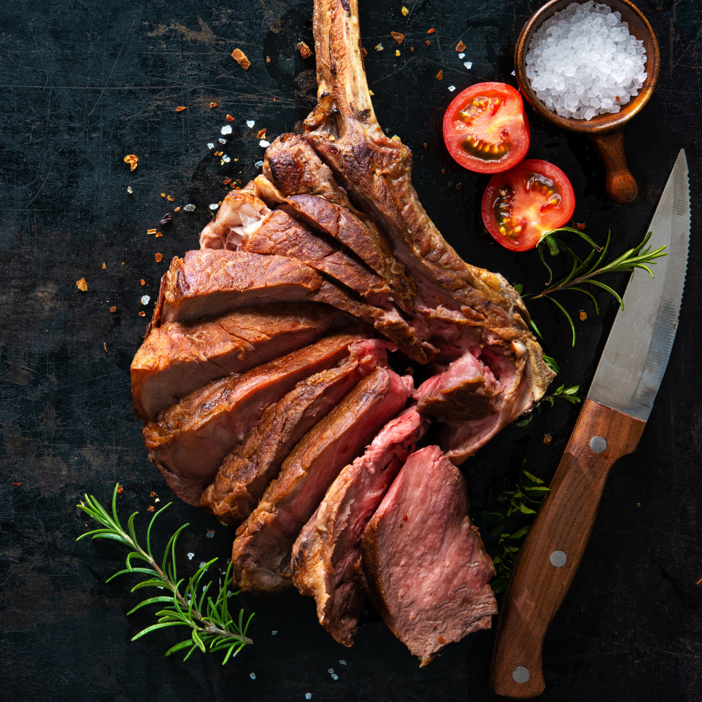 The tomahawk steak is a true showpiece, with its long bone and generous marbling that delivers rich, juicy flavour. Best cooked on the grill or in a cast-iron pan, this steak is perfect for reverse-searing to achieve a beautifully caramelized crust with a tender, melt-in-your-mouth centre. Serve it with roasted vegetables and a bold red wine sauce for a meal that will impress any guest.